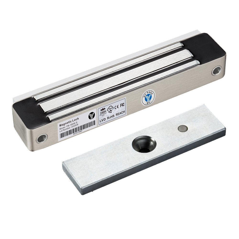 Електромагнітний замок Yli Electronic YM-180W-S — накладний вологостійкий замок, що має силу утримання до 180 кг та оснащений датчиком стану. Він підтримує сухі контакти (NO, COM) для моніторингу статусу блокування. Пристрій призначений для монтажу на металеві, скляні, дерев’яні та вогнетривкі двері, забезпечуючи надійне замикання за подачі живлення (DC12В / DC24В) через притягування відповідної планки. У разі вимкнення живлення замок автоматично відкривається, що відповідає вимогам протипожежної безпеки.