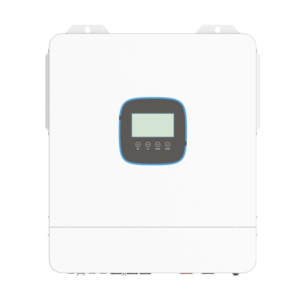 Гібридний однофазний інвертор з 2 MPPT-контролерами; максимальна потужність 11 кВт, максимальна короткочасна потужність 15.4 кВт (протягом 5 сек); правильна синусоїда на виході 220 В; 2 вбудовані MPPT-контролер та мережевий зарядний пристрій; максимальний струм заряду АКБ 120 А, сонячних панелей 160 А; вхідна напруга 90-280 В; діапазон напруги від сонячних панелей 60-500 В, макс. потужність 11000 Вт (5500 Вт *2); ККД 93%; вихідна напруга 208/220/230/240 В ±5%, вихідна частота 50/60 Гц; напруга акумуляторної системи 48 В; час перемикання на АКБ 10 мс; підтримка заряду АКБ типу AGM/GEL/LiFePo4/Li-ion, акумулятор купується окремо, можливість паралельного підключення батарей напряму до інвертора; комунікаційні інтерфейси RS485, USB, RS232; WiFi модуль у комплекті – для керування з мобільного застосунку; можливість паралельного підключення максимально 6 інверторів у систему для збільшення потужності чи налаштування трифазного режиму; режим підмішування; активне охолодження, рівень шуму жо 50 дБ; захист від глибокого розряду АКБ, перевантаження, короткого замикання, перегріву; робоча температура -10°C~+50°C; розміри 540 / 415 / 122 мм, вага 15.5 кг