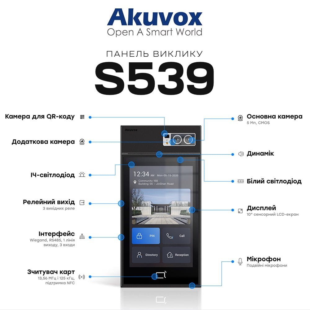 IP-відеопанель багатоабонентська 5Mp Akuvox S539 з екраном 10″, розпізнаванням облич та зчитувачем EM-Marine / Mifare / NFC / BLE / QR