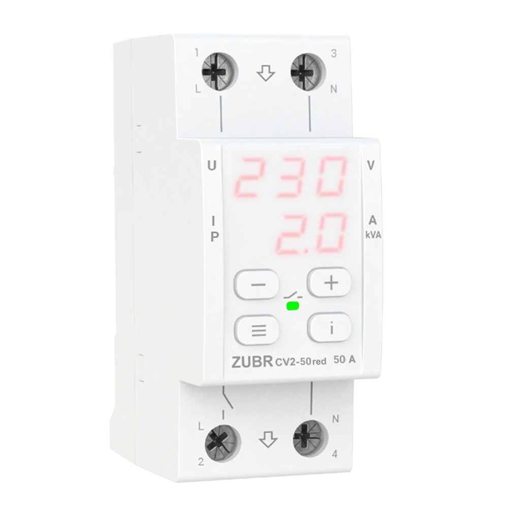 ZUBR CV2 red захищає обладнання від високої та низької напруги, обриву нуля, а також обмежує споживання струму чи потужності. При відхиленнях напруги ZUBR вимкне навантаження, а при перевищенні струму або потужності навантаження відключиться через заданий час затримки.