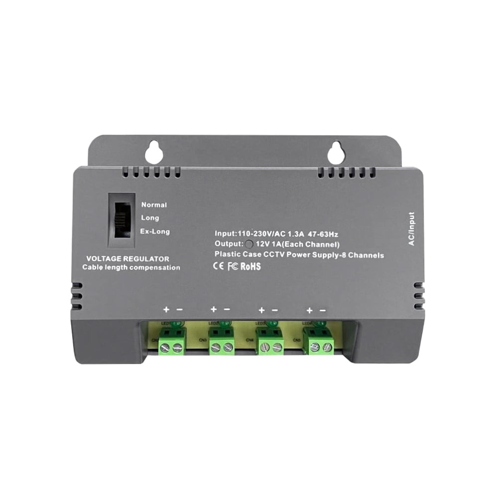 Імпульсний блок живлення на 4 канали навантаження; номінальна вихідна напруга 12 В, максимальний струм на канал 1 А; загальна вихідна потужність 60 Вт; вхідна напруга/струм AC 110-230 В/1.3 А; світлова індикація; захист від перевантаження за струмом, короткого замикання та перенапруги; пластиковий корпус, настінний монтаж; розміри 135 / 94 / 34 мм