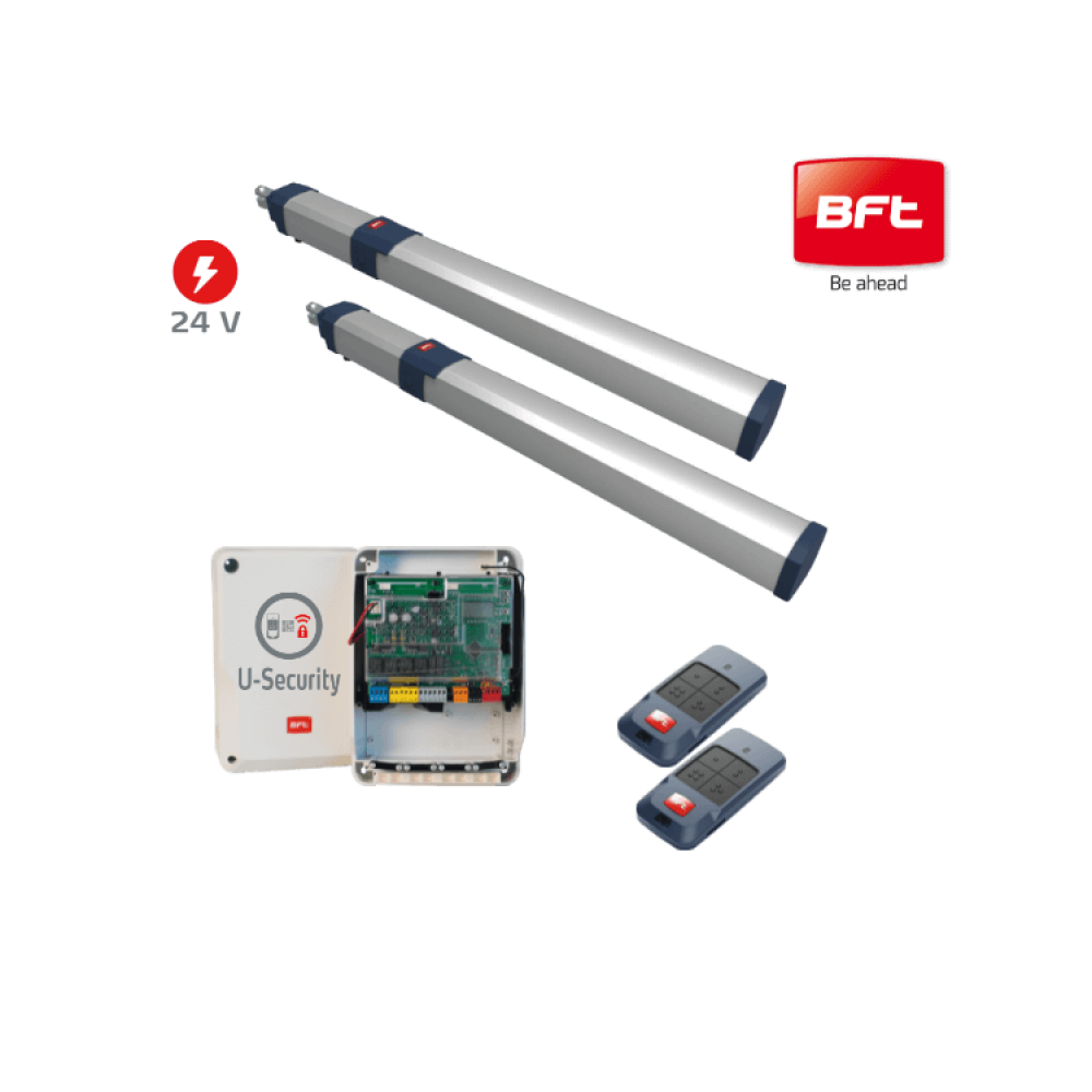 Комплектація включає два приводи GIUNO ULTRA BT A20, контролер THALIA BT A80 DUO у боксі CBOX DUO для систем 24V з вбудованим 4-канальним приймачем із пам’яттю до 128 пультів та дисплеєм для налаштування, а також два пульти MITTO COOL C4 з технологією U-Security.