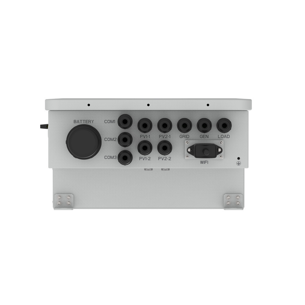 Гібридний однофазний інвертор. Номінальна потужність: 12 кВт. Напруга акумуляторної батареї: 48 В. Діапазон напруги батареї: 40-60 В. Макс. струм заряду акумулятора: 250 А. Макс. вхідна потужність PV: 15.6 кВт. Номінальна вхідна напруга PV: 370 В. Кількість трекерів МРРТ: 3. Форма вихідного сигналу: чиста синусоїда. Підключення генератора. Можливість роботи без підключення АКБ. Заряджання АКБ за розкладом. Інтерфейси управління RS485 / RS232 / CAN / Wi-Fi / GPRS. Можливість паралельного підключення: 16 пристроїв. Сенсорний дисплей LCD. Активне охолодження (вентилятори). Клас захисту: IP65. Розміри: 420 х 670 х 233 мм. Вага: 35.6 кг.