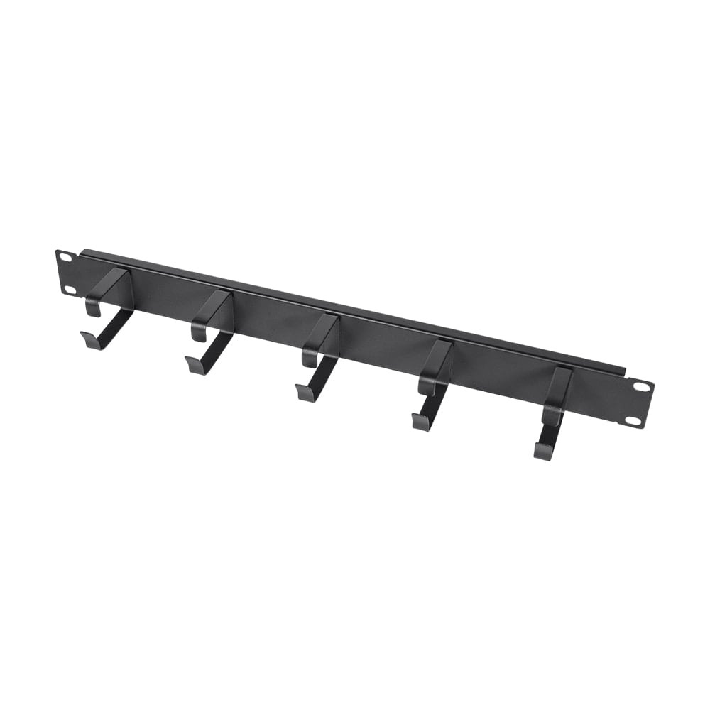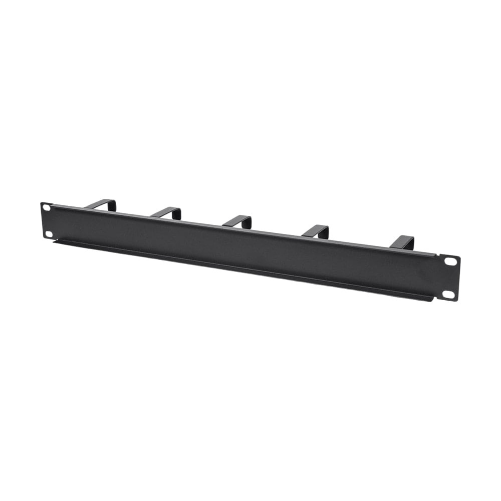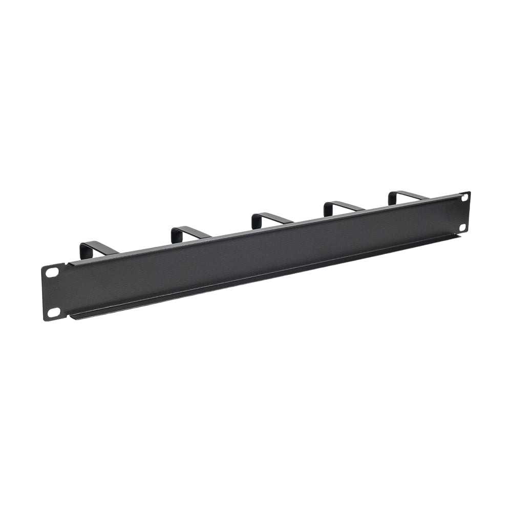 Кабельний організатор з 5 кільцями для встановлення у комутаційні шафи 19″; висота 1U; матеріал: сталь пофарбована у чорний колір; розміри 482 / 43 / 77 мм