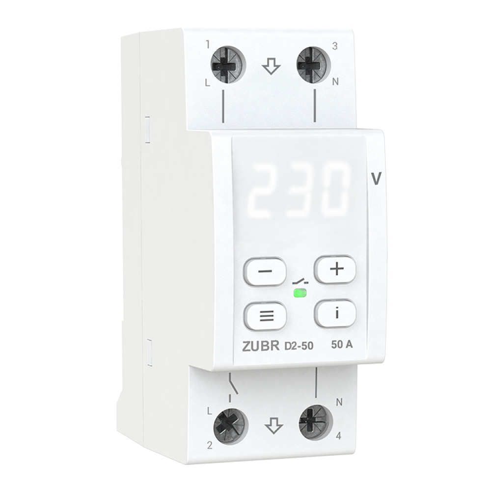 Реле напруги ZUBR D2 захищає від критичних стрибків високої та низької напруги, а також від обриву нуля. У випадку аварійної ситуації реле напруги відключає навантаження, а при нормалізації включає назад. Широкий функціонал реле напруги дозволяє оптимізувати кількість спрацьовувань завдяки індивідуальним налаштуванням під вашу мережу.