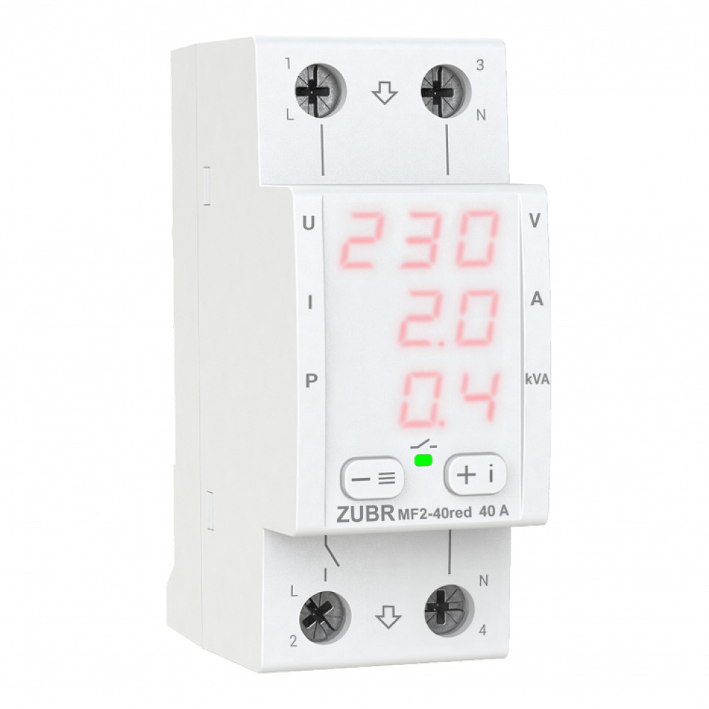 Мультифункціональне реле ZUBR MF2 має компактний корпус шириною 2 модуля. Завдяки трьом цифровим екранам, одночасно відображає значення напруги, струму і потужності, що дуже зручно при контролі всіх параметрів одночасно. У режимі очікування доступна можливість налаштування яскравості екрану. У реле ZUBR MF2 широкий функціонал, який об’єднав в собі: контроль напруги, струму та потужності, а також можливість поглиблених налаштувань.