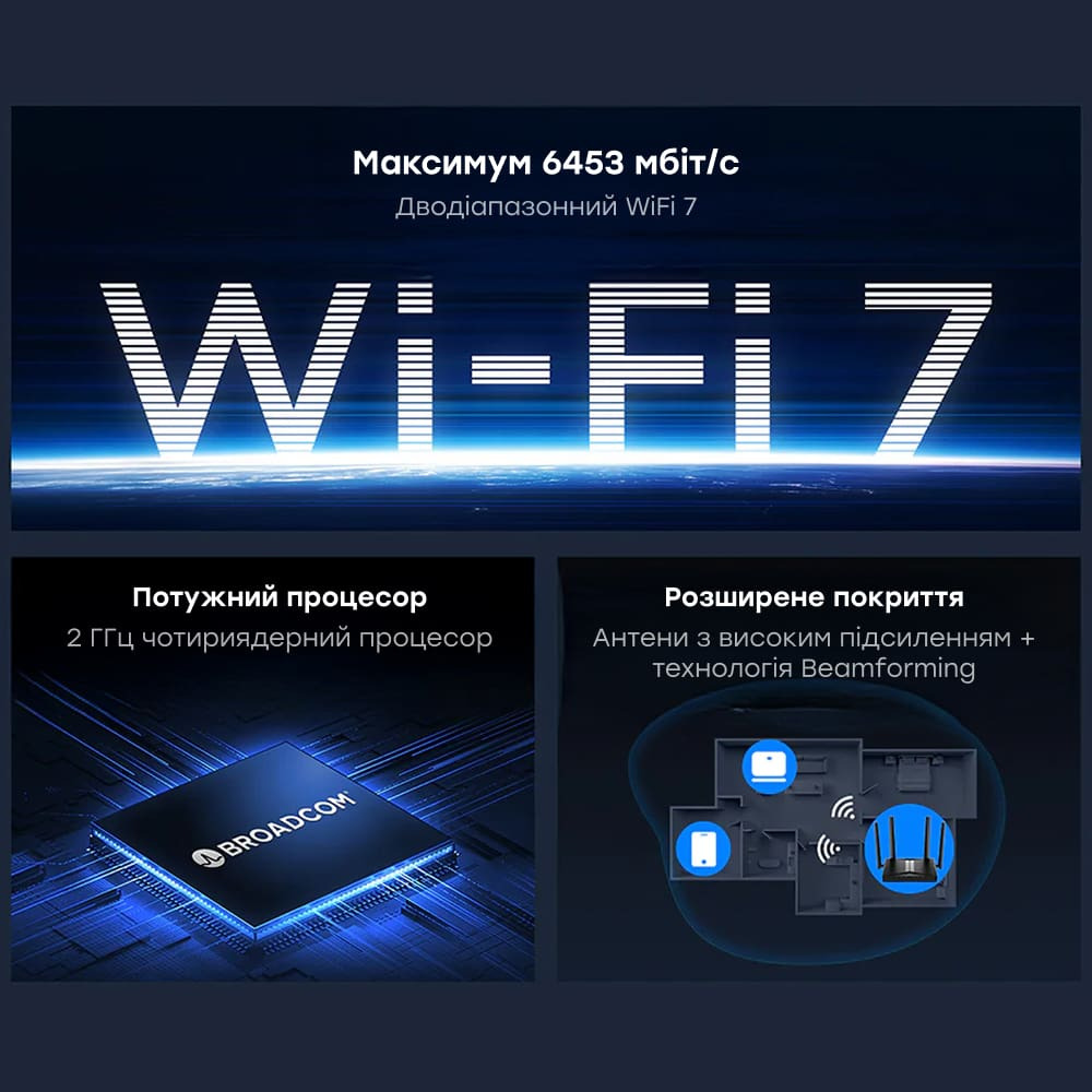 Дводіапазонний WiFi 7 Mesh гігабітний маршрутизатор; WiFi-стандарти 802.11be/ax/ac/a/b/g/n; 5760 Мбіт/с на 5 ГГц + 688 Мбіт/с на 2.4 ГГц; порти: 1 WAN 2.5G, 4* LAN 10/100/1000 Мбіт/с; ширина каналу: 20/40/80/160 МГц; можливість підключення до 200 пристроїв; 4-ядерний процесор ARM Cortex-A7 2 ГГц; 6 фіксованих антен: 5.27dBi (5 ГГц), 5.19dBi (2.4 ГГц); режими WiFi-маршрутизатор / Mesh / розширювач / AP – точка доступу / WISP; MLO, MRU, Puncturing, MU-MIMO, OFDMA, Beamforming; DDNS; VPN клієнт PPTP / L2TP / OpenVPN / WireGuard / IPsec; підтримка сервісу Zerotier; DNS через CloudFlare / Quad9 / Google; IPv4/IPv6, безшовний роумінг; WPA3; протоколи віддаленого керування TR069 / TR098 / TR111 / TR181; живлення 12 В/1.5 А, блок живлення у комплекті; робоча температура 0°C~+40°C; розміри 253 / 152.5 / 48.2 мм; вага 580 г